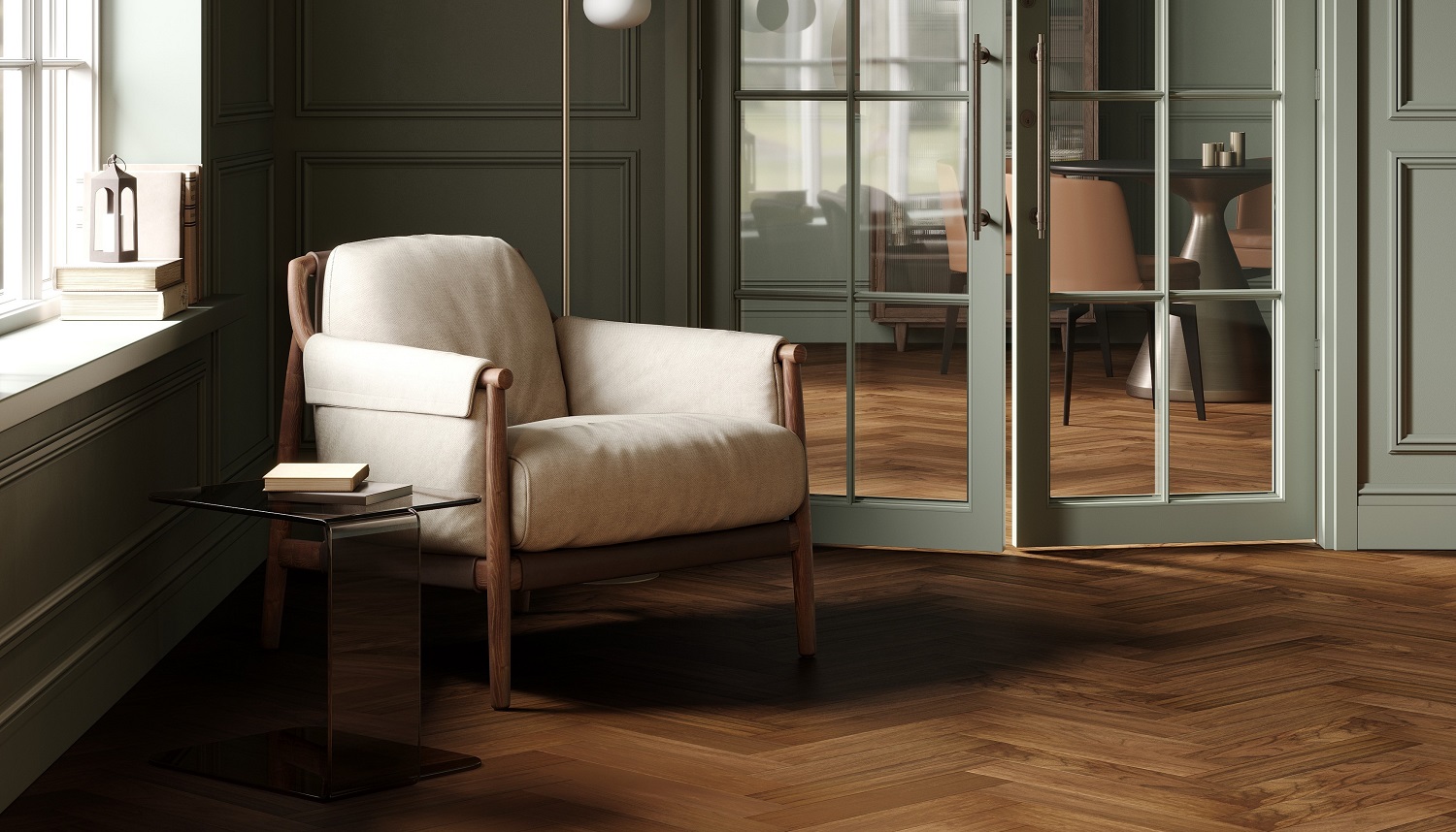 Важнейшую роль играет напольное покрытие — кварцевый паркет Quartz Parquet. Текстура натурального дуба с деликатным брашем отсылает к полу старинных особняков. При этом материал практичен, долговечен и полностью соответствует требованиям современной семьи.